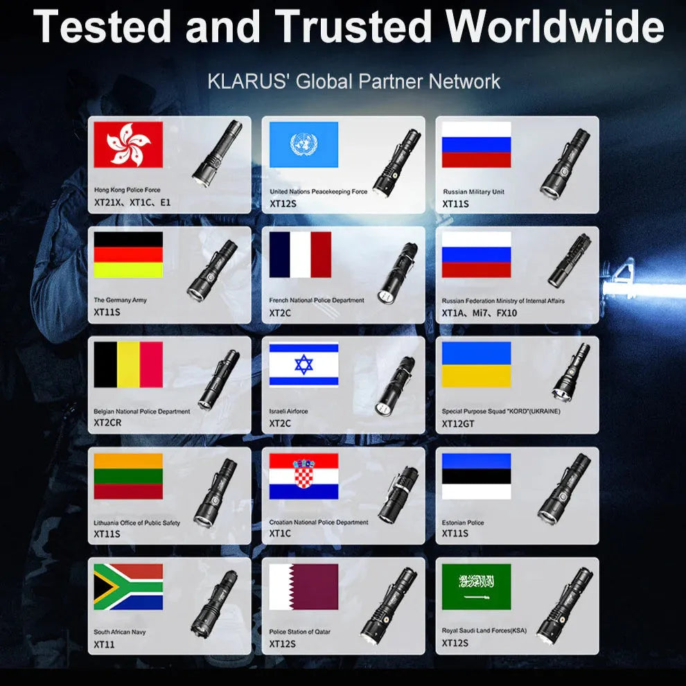 KLARUS XT21X Pro er en kraftig oppladbar taktisk lommelykt med en imponerende lysstyrke på opptil 4400 lumen og en rekkevidde på 316 meter. Perfekt for taktiske operasjoner, friluftsliv og nødbruk.