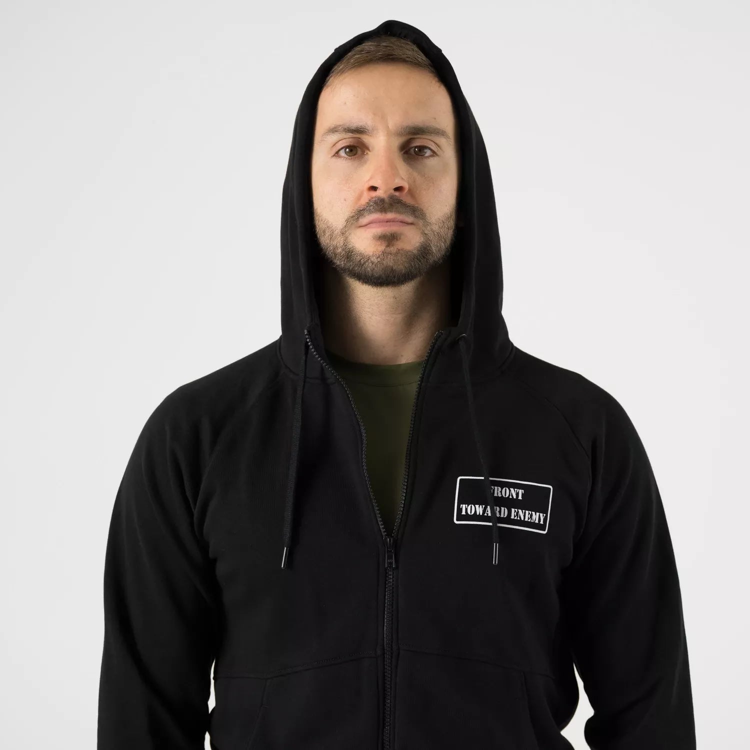 Denne Front Toward Enemy hoodien er en lett og behagelig hettegenser laget for daglig bruk. Den har hel glidelås, justerbar hette og to romslige hoftelommer. Praktisk når du vil ha en enkel genser som funker i byen, på reise og til pendling.