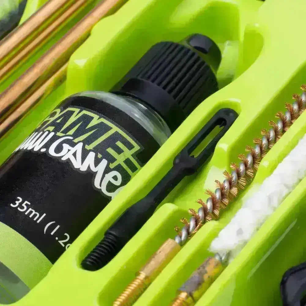 Sprzęt do czyszczenia znajduje się w osobnym pudełku z pokrywką. Każda część ma swoje miejsce, dzięki czemu wszystko jest uporządkowane i zawsze łatwo dostępne. W zestawie znajduje się mały pojemnik na olej, do którego możesz wlać taki olej, jaki chcesz, dzięki czemu swój ulubiony olej będziesz miał przy sobie w zestawie wraz z całym pozostałym sprzętem.
