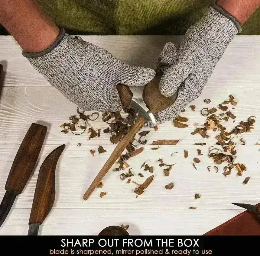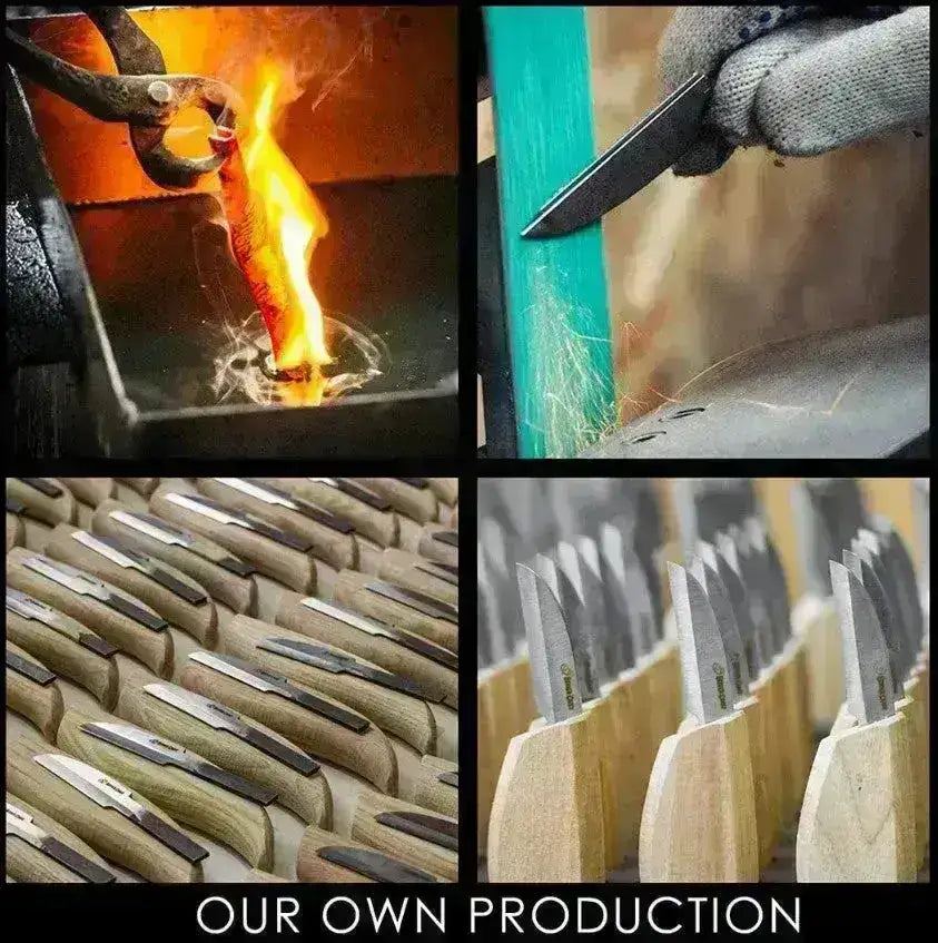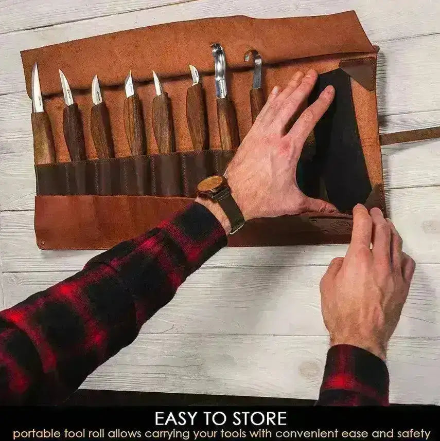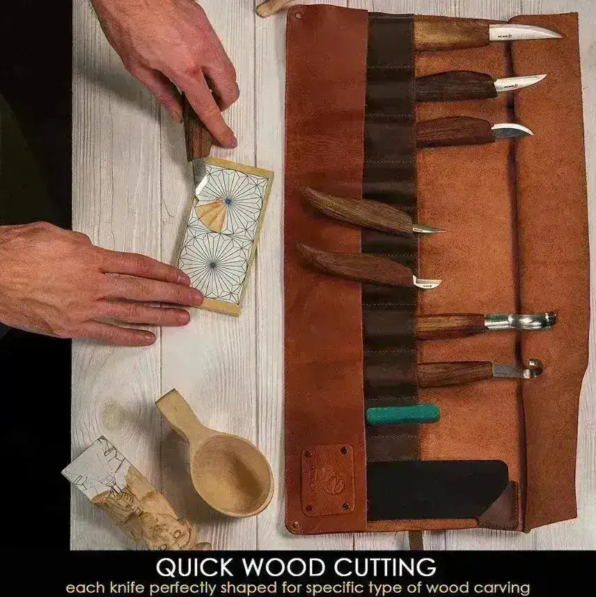Kompletny zestaw ze WSZYSTKIM, czego potrzebujesz do noży! Ręcznie robione noże z Ukrainy. Zestaw S18X jest idealny dla tych, którzy poszukują dobrego sprzętu do cięcia drewna, pozwalającego na precyzyjne i wydajne kształtowanie i drążenie drewna. Zakrzywiony nóż i dłuto w tym zestawie do rzeźbienia idealnie nadają się do wydrążania łyżek, misek itp.; dołączone do zestawu noże pozwalają na tworzenie pięknych motywów i detali w drewnie. Wszystko to zapakowane w ekskluzywną, pachnącą i, co równie ważne, wytrzymałą skórzaną teczkę, którą można zwinąć!