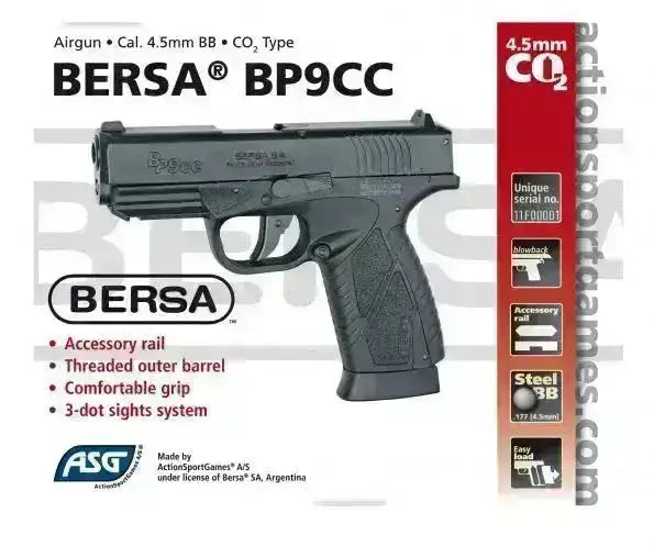 BP99CC to półautomatyczny pistolet Airsoft na kulki BB kal. 6 mm z systemem Blowback, w pełni licencjonowany przez BERSA. To lekki, kompaktowy i wyjątkowo cienki pistolet o ergonomicznej konstrukcji, która zapewnia wyjątkowo dobrą widoczność. Karabin zasilany jest nabojem CO2 o masie 12 g umieszczonym w rękojeści, który można szybko wymienić dzięki systemowi „easy-load”. Pociski BB umieszczane są w magazynku typu stick, który można łatwo wyjmować i wkładać. pistoletu. Pistolet wyposażono także w szynę 21 mm pod lufą, na której można zamocować latarnia Lub laser.