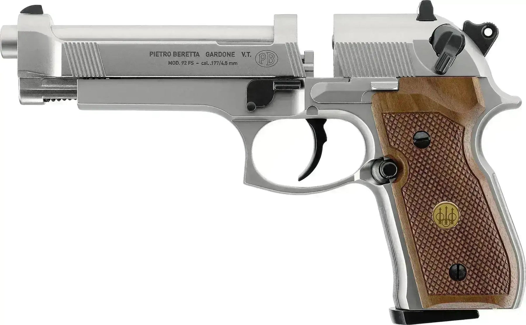 Odkryj klasyczny włoski design z pistoletem Beretta 92FS Nickel Wood Grip o kalibrze 4,5 mm. Ten pistolet pneumatyczny łączy w sobie styl i wydajność, dzięki czemu doskonale nadaje się zarówno dla początkujących, jak i doświadczonych strzelców. Realistyczna waga i autentyczny drewniany uchwyt zapewniają doskonałe wyczucie broni i sprawiają, że broń ta idealnie nadaje się do precyzyjnego strzelania i kolekcjonowania.