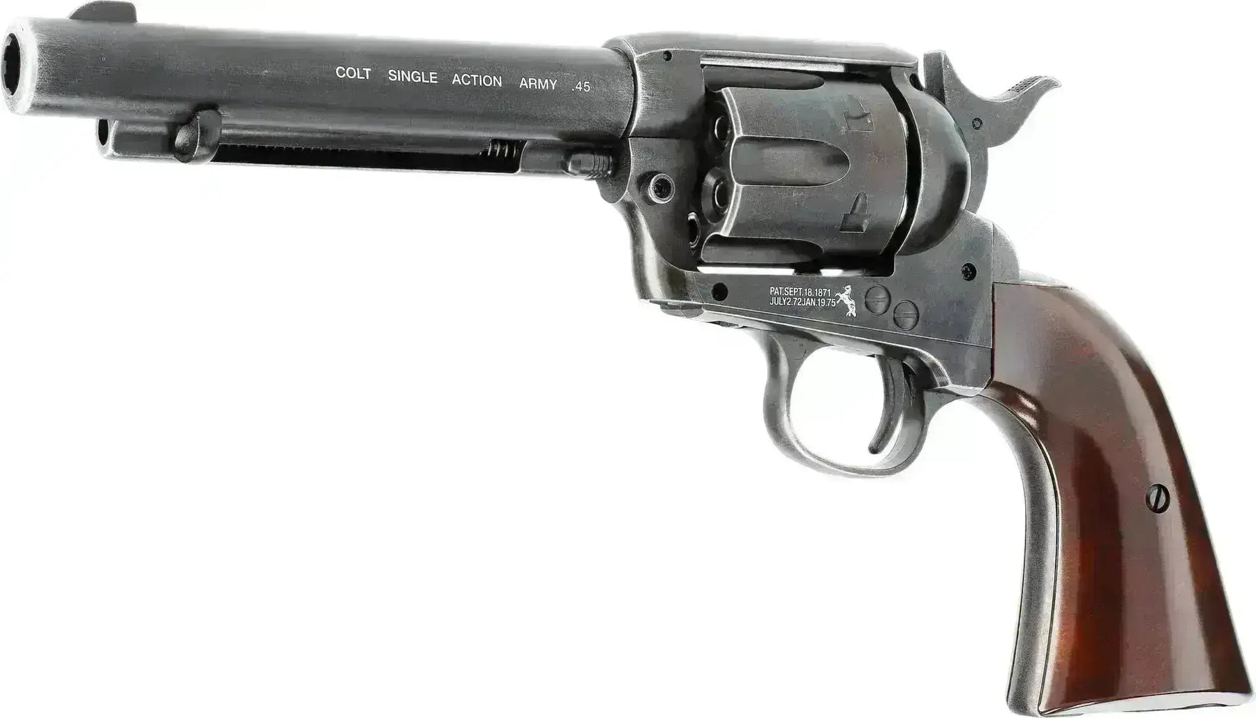 Wersja tego klasycznego rewolweru na śrut 4,5 mm to prawdziwa uczta dla oczu, a wyglądem, wyczuciem i funkcjonalnością dorównuje oryginalnemu Colt Peacemaker kal. 45. Podobnie jak w prawdziwym rewolwerze lufa w tym egzemplarzu nie wydłuża się. Każdy nabój ładowany jest osobno do otworu ładującego znajdującego się po prawej stronie bębenka. Odciągnij kurek do połowy, następnie obróć lufę i włóż nowy nabój. Aby wyjąć pusty wkład, wykonaj dokładnie tę samą czynność w odwrotnej kolejności i naciśnij dźwignię zwalniającą. Aby załadować naboje śrutem, należy włożyć pocisk do dolnej części magazynka, co oznacza, że nie trzeba wyjmować nabojów, aby je załadować. Wersja na śrut, którą tutaj otrzymasz, posiada gwintowaną lufę dla zapewnienia większej precyzji!