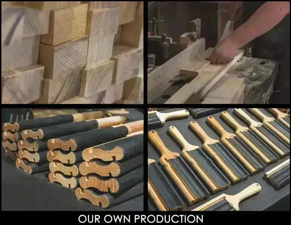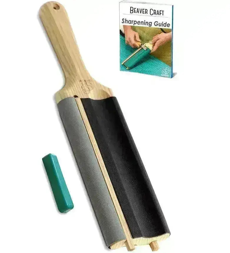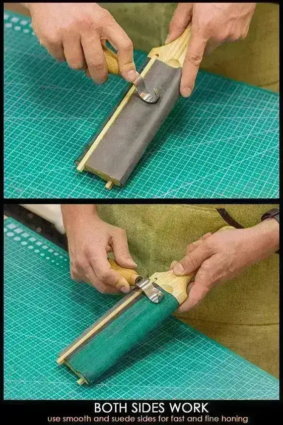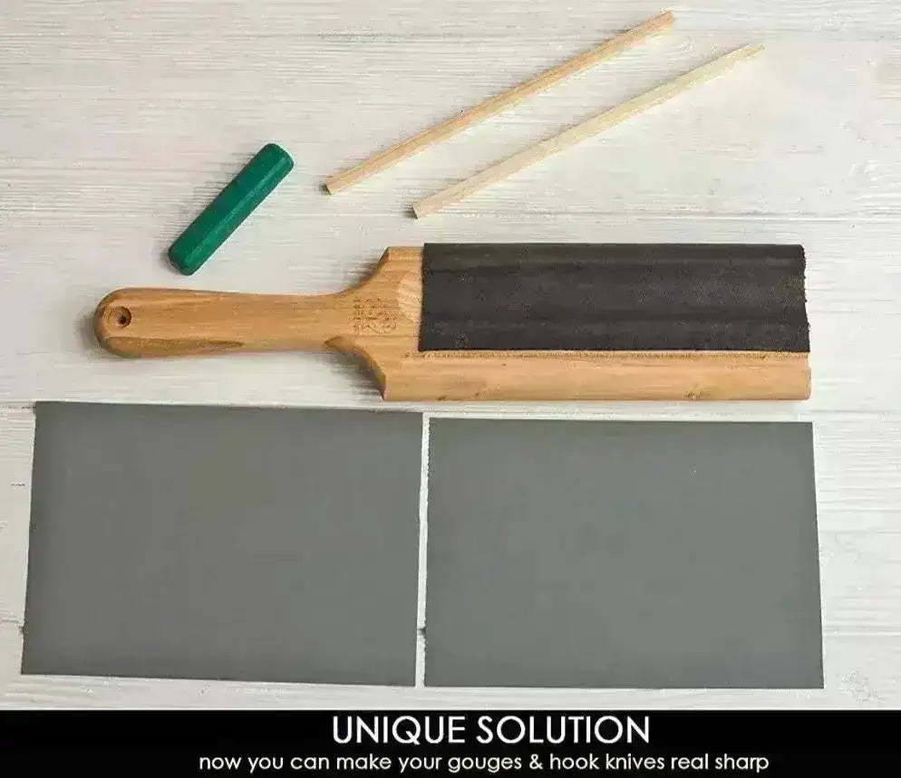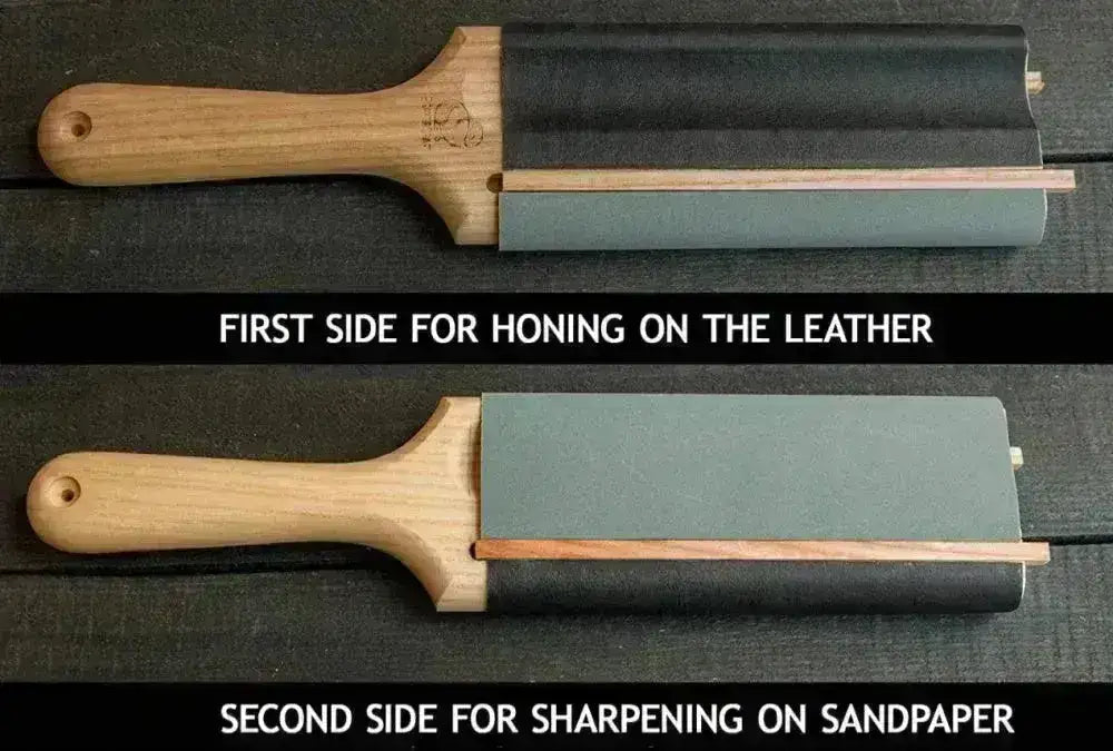Jedna strona klocka jest pokryta skórą, a druga papierem ściernym. W zestawie znajduje się zielona i szara pasta polerska, a także instrukcja obsługi, dzięki której można idealnie polerować i konserwować noże.