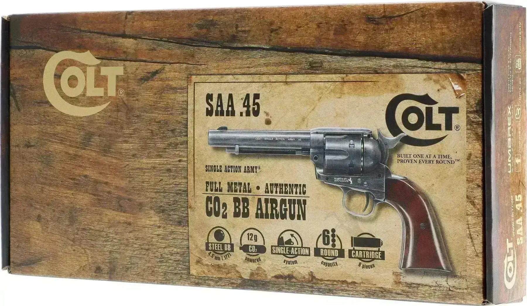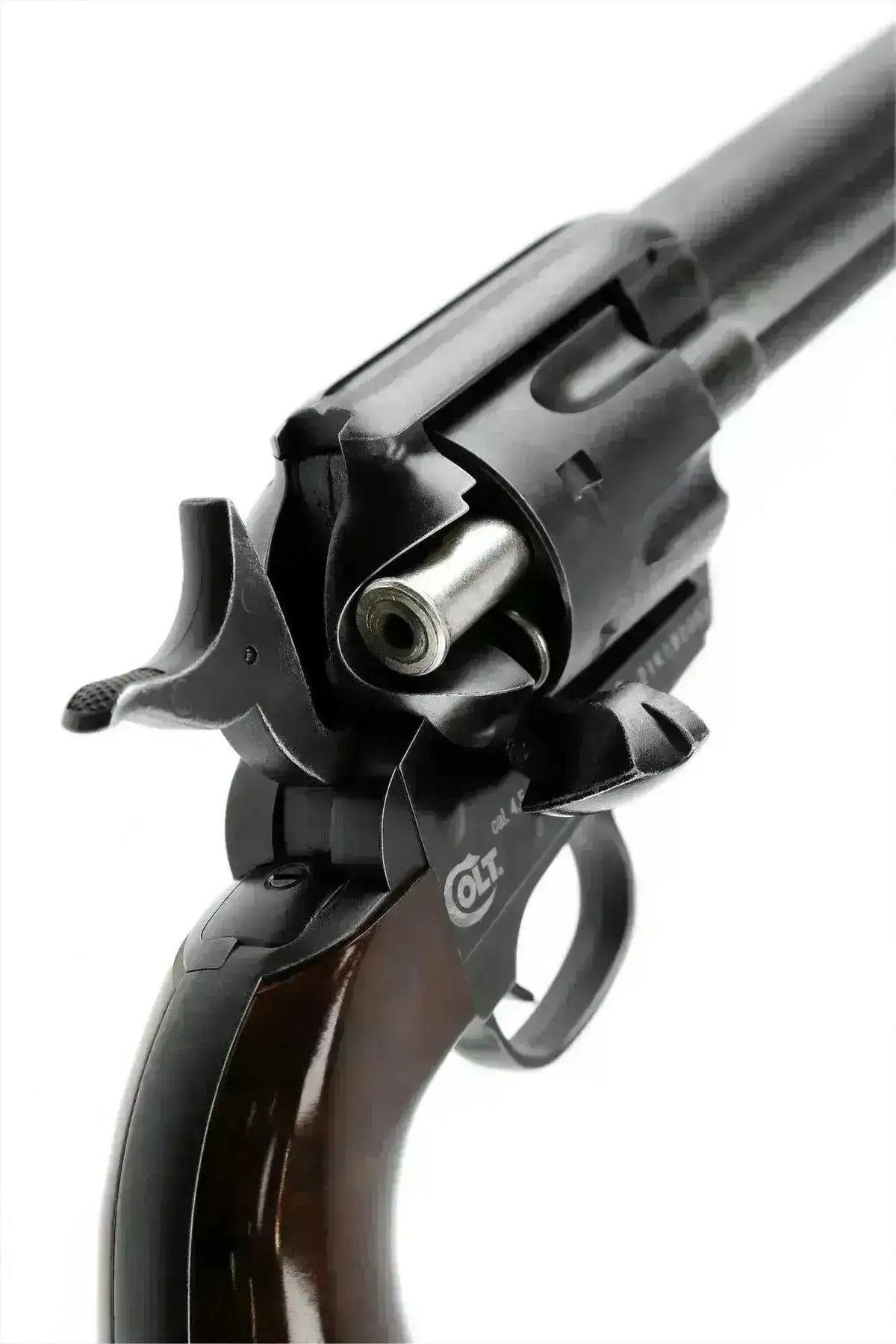 Wersja 4,5 mm BB tego klasyka to prawdziwa uczta dla oczu, a rewolwer ma taki sam wygląd, charakter i funkcjonalność jak oryginalny Colt Peacemaker .45. Podobnie jak w przypadku prawdziwego rewolweru, lufa tego również nie jest wysuwana. Każdy nabój ładowany jest indywidualnie do otworu załadunkowego po prawej stronie cylindra. Pociągnij kurek do połowy do tyłu, następnie obróć lufę i włóż nowy naładowany nabój. Aby wyjąć pusty wkład, wykonaj dokładnie te same czynności w odwrotnym kierunku i naciśnij drążek zwalniający. Aby załadować naboje kulkami BB, należy włożyć kulkę BB w spód każdego naboju.