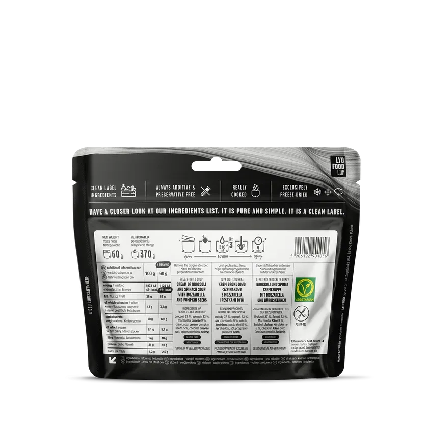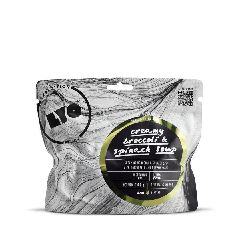 LYOFOOD Creamy Broccoli & Spinach Soup kombinerer brokkoli, spinat og fløte til en varmende og smakfull suppe. Laget med 100 % naturlige ingredienser, helt uten gluten og kunstige tilsetningsstoffer. Perfekt som lett middag, forrett eller mellommåltid på fjelltur, ekspedisjon eller camping der lav vekt og rask energi er viktig.