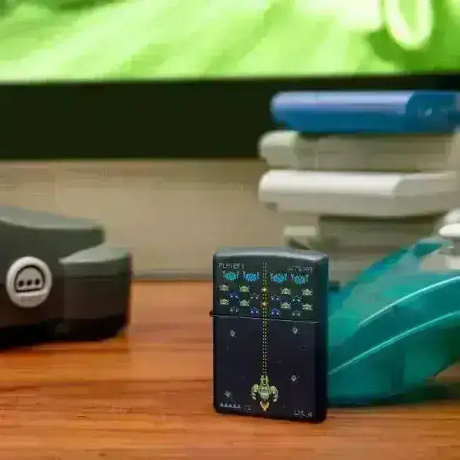 Retro gamingowa Zippo dla graczy i wszystkich, którzy kochają rzeczy retro - Matowe granatowe tło z nadrukiem pikselowej gry