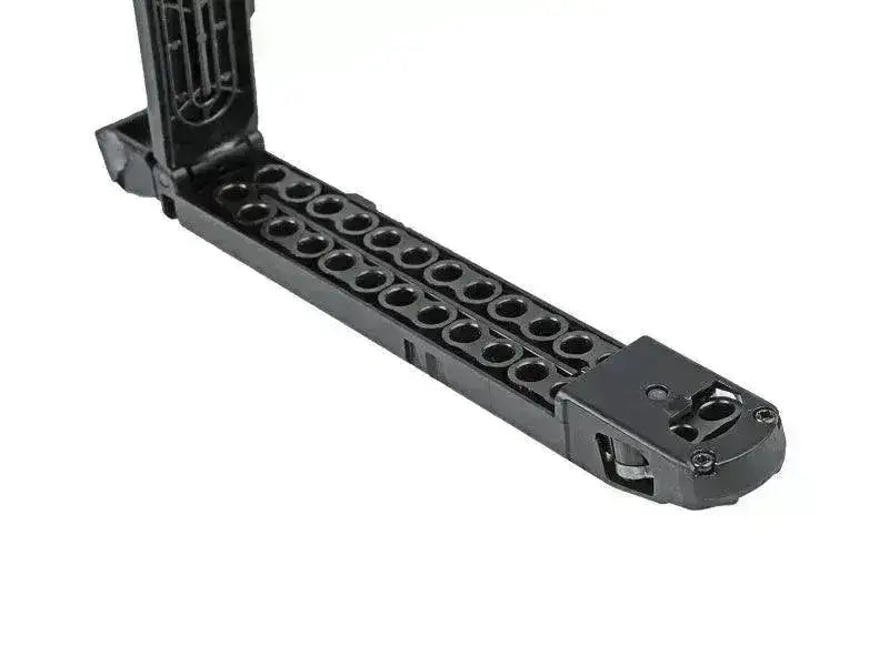 Zbudowany z solidnego metalowego zamka i polimerowej ramy, a także z imponującą pojemnością 30(!!!) naboi w magazynku, jest to pierwszy pistolet tego typu. Magazynek zasilany jest taśmowo, a broń jest półautomatyczna i może strzelać zarówno śrutem kal. 4,5 mm, jak i kulkami BB, gdy tylko naciśniesz spust! Dzięki realistycznemu odrzutowi pocisku i zasilaniu 12-gramowym nabojem CO2 trzymanym w chwycie, możesz wystrzelić amunicję z prędkością do 430 fps!!! (w zależności od wagi/składu amunicji). Dzięki tak dużej pojemności magazynka, ten pistolet zapewni Ci wiele godzin świetnej zabawy!
