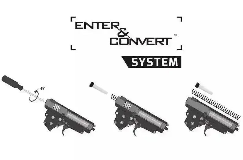 Zaraz po wyjęciu z pudełka karabin osiąga prędkość 380 fps. Idealny na średnie odległości. Jeśli zamierzasz grać w pomieszczenie / CQB, zalecamy przejście na dostarczoną sprężynę M90, wówczas zejdziesz do około 310 fps. Jest to łatwe, dzięki systemowi Enter i Convert - który pozwala zmienić pióra w ciągu kilku minut bez konieczności rozbijania całego karabinu.