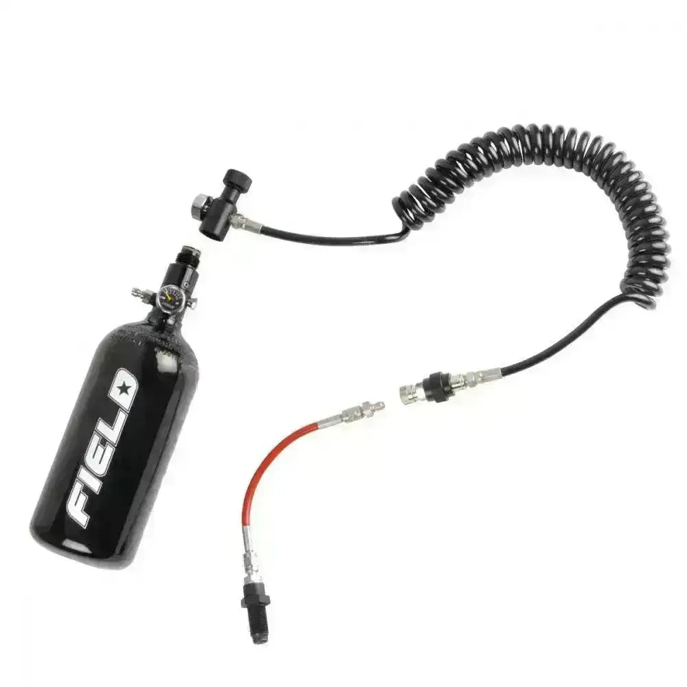 Prosta konfiguracja, podłącz zbiornik do węża, podłącz wąż do karabinu. Przykładowo, zbiornik można przechowywać w plecaku, co pozwala na używanie karabinu jako karabinu PCP na sprężone powietrze, bez konieczności trzymania zbiornika na miejscu. Dzięki temu zestawowi nie tylko wykonasz więcej strzałów na raz, ale strzały będą również bardziej precyzyjne.