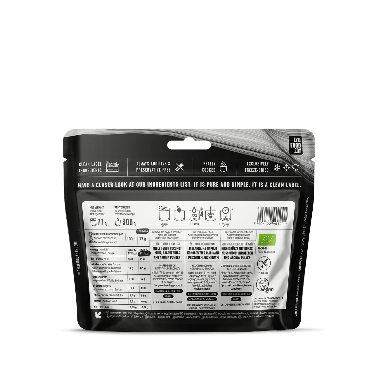 LYOFOOD Raspberry Millet Porridge – Økologisk hirsegrøt med bringebær og aroniapulver