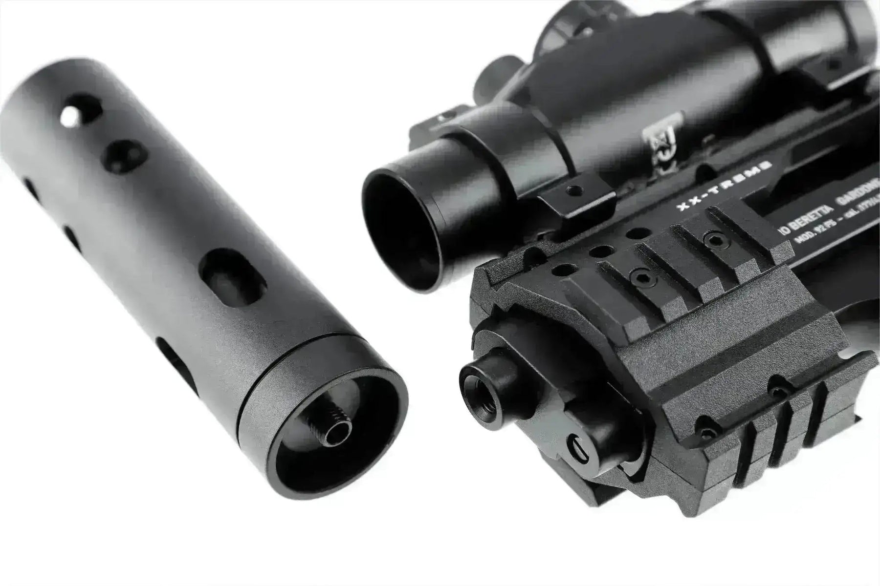 Wykonana na licencji firmy Beretta, ta replika karabinu M9 to czysta przyjemność strzelania. Spusty pojedynczego i podwójnego działania w połączeniu z gwintowaną lufą stalową zapewniają doskonałą precyzję. Broń jest ponadto wyposażona w szynę montażową do celownika kolimatorowego i celownika kolimatorowego. Moderator w zestawie.