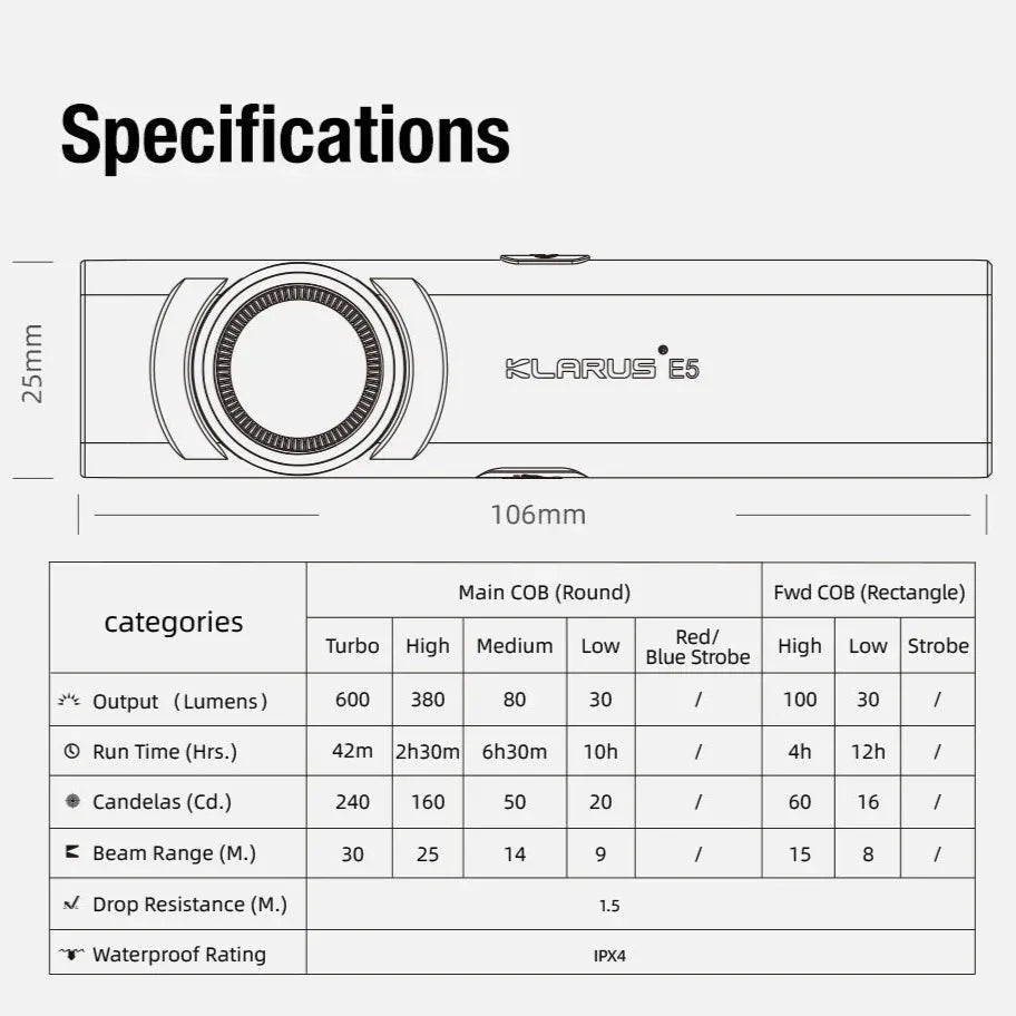 Klarus - E5 Svart - Oppladbar Tur og Lommelykt - 100+600 Lumen