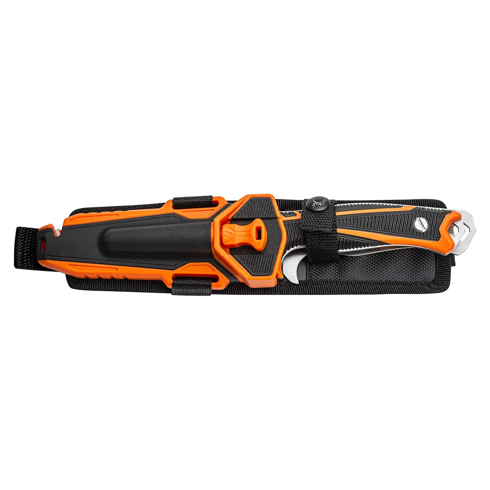 Bladene er laget i rustfritt stål med satengbørstet overflate som gir lang levetid og beskytter mot rust. Håndtaket har en oransje og sort gummiert overflate for sikkert grep under alle forhold og for å enkelt finne igjen om du skulle miste den. Sliren er laget i formstøpt nylon med beltefeste og har innebygd tennstål og keramisk slipestein – slik at du alltid har alt du trenger for å holde kniven skarp og klar til bruk.
