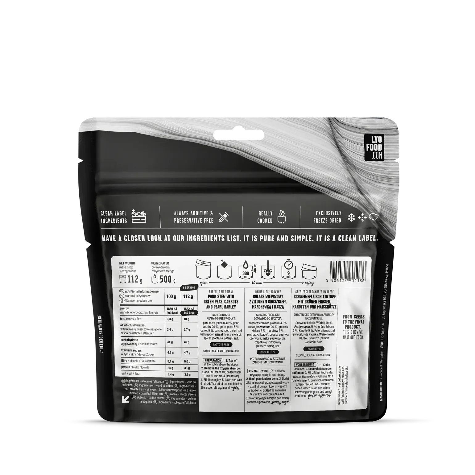 LYOFOOD Svinegryte byr på ekte håndlaget smak med møre svinebiter, grønnsaker og en fyldig krydret saus. Perfekt for lange dager i fjellet, på jakt eller på ekspedisjon. Retten er laget med 100 % naturlige ingredienser, ingen konserveringsmidler, frysetørket for lav vekt og lang holdbarhet.