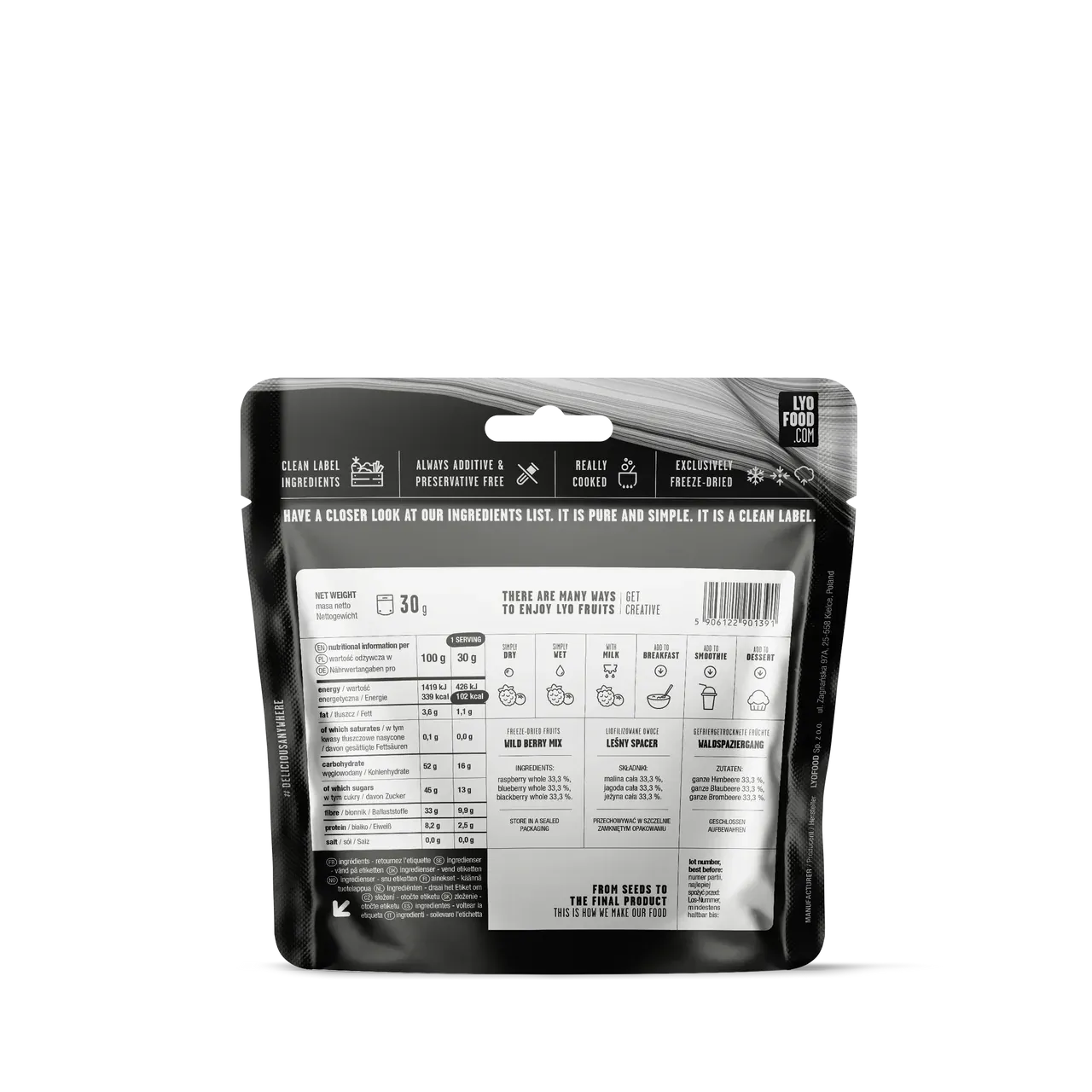 En fruktig miks av bringebær, blåbær og bjørnebær – perfekt som snacks eller til frokostblanding, smoothie og dessert. LYOFOOD Wild Berry Mix er laget uten tilsatt sukker og konserveringsmidler, kun 100 % naturlige bær. Sprø og smakfull rett fra posen, eller gjenopprettet med vann eller melk.