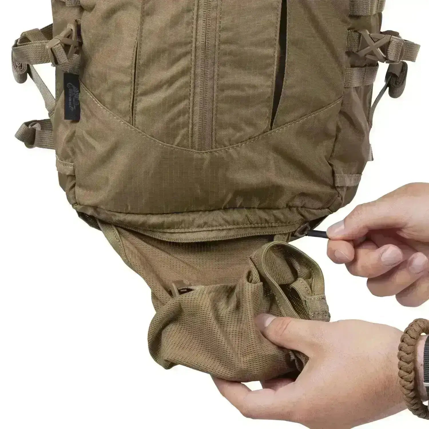Po obu stronach plecaka znajdują się dwie zapinane na zamek kieszenie z dodatkowymi siatkowymi uchwytami na butelki, stabilizowane paskiem kompresyjnym. Dodatkowo po obu stronach plecaka znajdują się dwa rzędy taśm MOLLE Lite, co daje możliwość dołączenia dodatkowych kieszeni. Węższa szerokość taśmy sprawia również, że torba jest lżejsza.