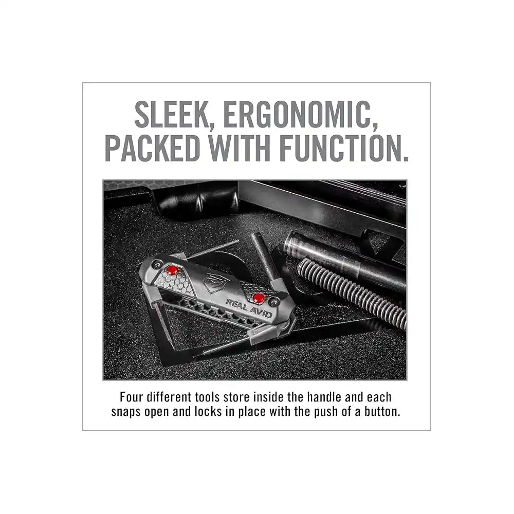 Verktøyet kombinerer pinneutslager 3mm, magnetisk sekskant-skrutrekker til frontsikte, flat skrutrekker for låse- og boltkomponenter samt en liten unbrako til finjustering av baksikte. Det ergonomiske “foldekniv”-huset åpnes med en knapp som frigjør fjærmekanismen og vipper ut valgt spiss.