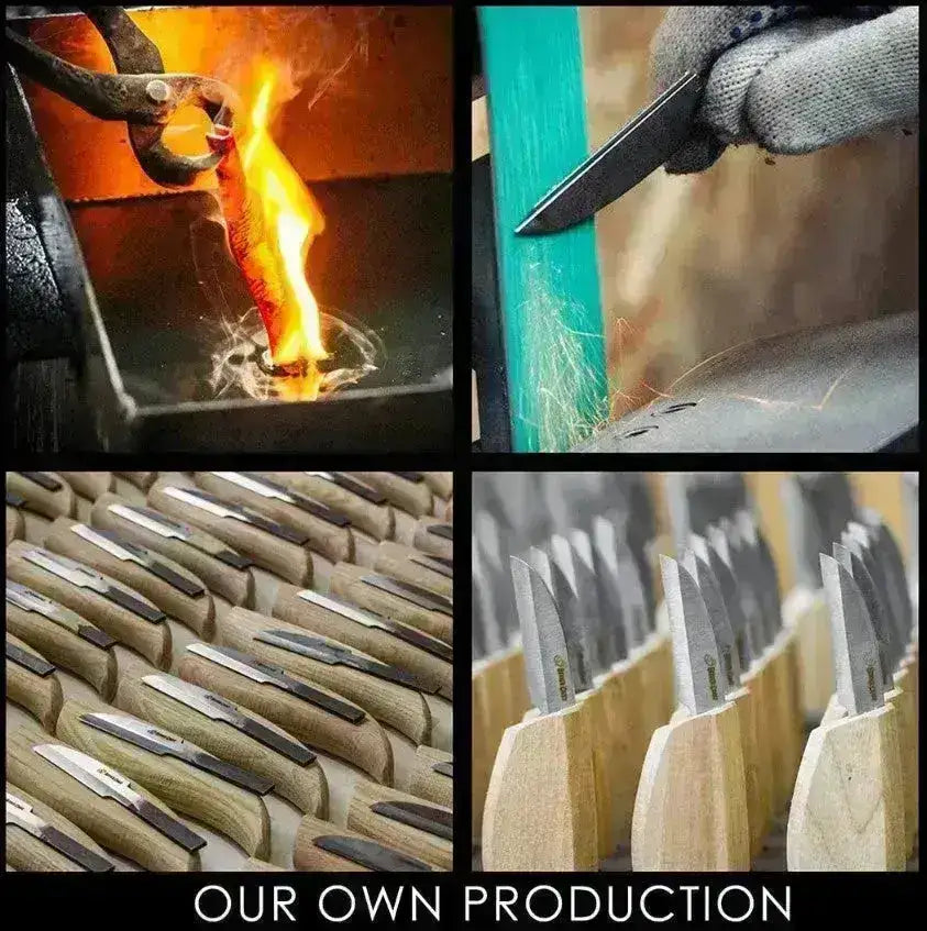 Ostrza noży wykonane są ze stali o wysokiej zawartości węgla. wszystkie noże są wykonywane ręcznie, a ich jakość jest nienaganna. Dzięki zastosowaniu stali węglowej nóż zyskuje dobre właściwości, dzięki którym jest ostry i wytrzymały, a jednocześnie zachowuje ostrość przez długi czas. Ważne jest, aby po użyciu wycierać nóż i regularnie go oliwić, ponieważ może on rdzewieć.